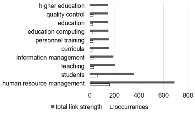 The rest of the keywords behave similarly in terms of frequency, with “quality control” (25) standing out, which confirms the initial findings of this research that control studies on HMT in universities have focused more on accreditation and quality processes. When analyzing the total link strength, it is confirmed that the main links, as well as the frequency, are found in human resource management, with 691 connections to the other terms. In a lower position, the terms student and teaching appear, with 362 and 203 respectively (graphic 4). This shows that the search is related, in addition to the HTM process, to the training ones in universities.