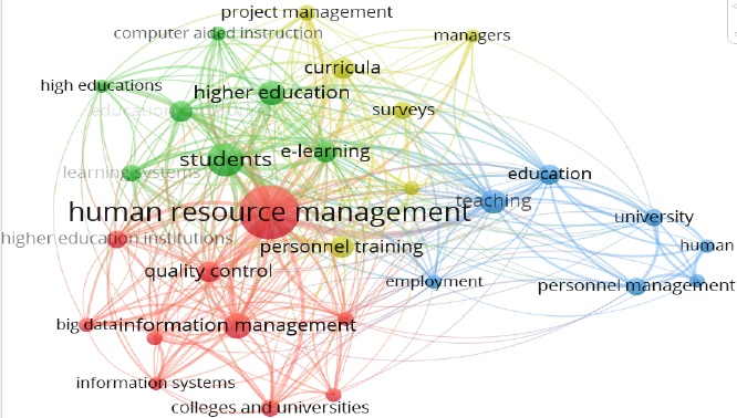 In the analysis, four keyword groups are created, which indicate the main research groupings. The red group highlights “human resource management” along with other keywords such as “higher education institutions,” “quality control,” and “information management.” The green group includes the keyword “student” along with others like “e-learning,” “learning system,” and “higher education.” The blue group contains keywords such as “teaching,” “education,” “humans,” “employment,” “university,” and “personnel management.” Finally, the yellow group contains terms related to “curricula” linked to keywords like “professional aspects,” “personnel training,” “surveys,” and “managers.”