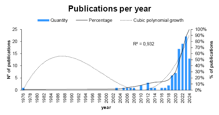 Esta bibliometría ha revelado un notable incremento en la publicación de artículos sobre el uso de técnicas de inteligencia artificial en la investigación científica. El gráfico 1 ilustra un aumento siguiendo una tendencia de crecimiento polinomial cúbico en el 93,2% de los casos analizados. Los años 2023, 2022, 2021 y 2024 se destacaron como los períodos con mayor número de publicaciones en esta área, sugiriendo un interés creciente y sostenido en la aplicación de inteligencia artificial en la investigación científica a lo largo del tiempo.