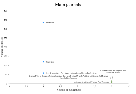 Para las principales revistas científicas (gráfico 3), se identificaron dos grupos distintos según su productividad e impacto. Se halló un grupo de revistas que, aunque tienen un bajo índice de productividad científica, muestran un impacto notable en sus publicaciones. Otro conjunto de revistas sobresale por su alta productividad, aunque no alcanzan un elevado número de citaciones en sus artículos. Dentro de estas revistas destacan Innovation y Cognition en el primer grupo, mientras que Advances In Intelligent Systems And Computing y Communications In Computer And Information Science figuran en el último grupo.