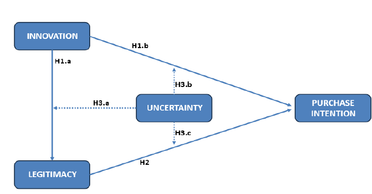 Moreover, legitimacy positively impacts purchase intent (H2). We also propose that uncertainty moderates the relationships between legitimacy and innovation (H3a), purchase intention and innovation (H3b), and legitimacy and purchase intention (H3c).