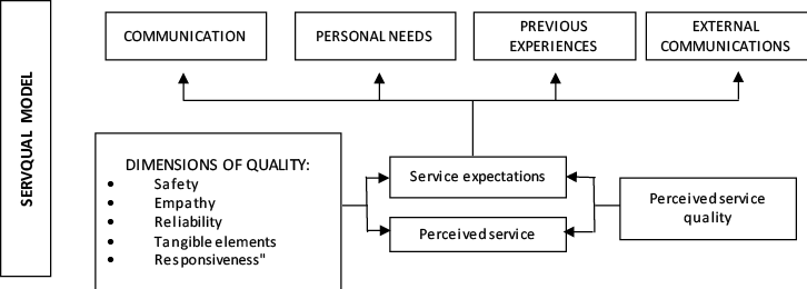 El modelo SERVQUAL (calidad del servicio) evalúa la calidad del servicio desde la perspectiva del usuario, mediante la comparación entre expectativas y percepciones. Su fundamento radica en que la calidad del servicio representa la discrepancia entre lo esperado y lo experimentado. SERVQUAL se destaca por su validez y confiabilidad, siendo un modelo ampliamente utilizado en estudios empíricos sobre la calidad de los servicios públicos (Rindfleisch & Moorman, 2001; Wuyts et al., 2004; Losada & Rodríguez, 2007; Miranda, Chamorro & Rubio, 2007; Gola, 2016; Chicoine & Guzmán, 2017; McKenna et al., 2018; Choowan et al., 2024).