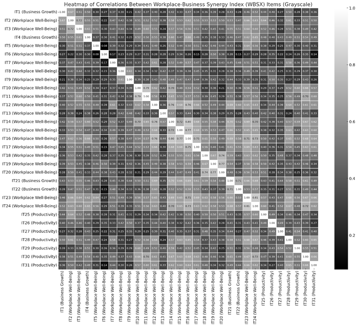 Note: This heatmap presents the correlations between the items of the Workplace-Business Synergy Index (WBSX) across its three main variables: Business Growth, Workplace Well-Being, and Productivity. Correlation values are represented on a grayscale color scale, where lighter shades indicate lower correlations, and darker shades represent higher correlations. This figure was generated using data collected during the study, providing a visual representation of the consistency and relationships between the items and the sections of the index. Source. Data derived from the study conducted by the authors (2025).