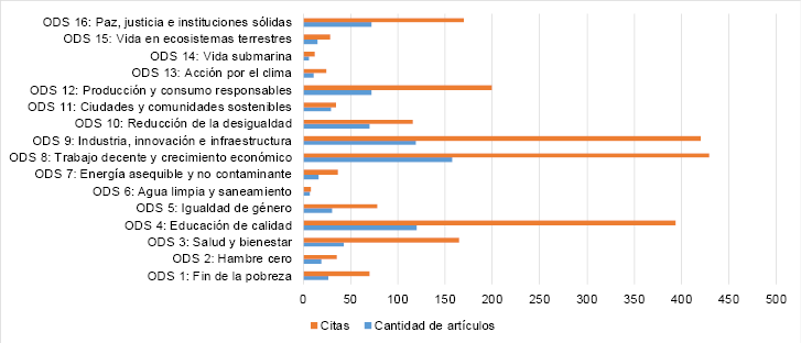 Desde cada una de estas áreas, se perfilan ediciones con temas específicos de discusión, algunos alineados con los Objetivos de Desarrollo Sostenibles, fundamentalmente el ODS 8: Trabajo decente y crecimiento económico, y el ODS 09: Industria, innovación e infraestructura, alimentando también desde la transversalidad de la gestión educativa, el ODS 4: educación de calidad. Con relación al ODS 12: producción y consumo responsable, los artículos publicados son pocos, lo que permite afirmar una producción baja. Las aportaciones de la ciencia a los ODS es un tema crucial. Por tanto, alinear estrategias y acciones hacia los ODS en los que puede aportar la Revista, es fundamental. La ciencia y el mundo avanzan, y los logros desde los esfuerzos sostenidos, serán más provechosos para las partes involucradas (Gráfico 1).