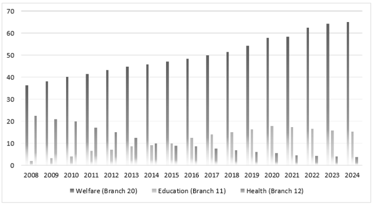 Throughout the period under review, resources have been concentrated in administrative branches such as Welfare, where universal and welfare-oriented programs prevail—programs that are not specifically designed to address structural gender inequalities. This pattern reflects a limited interpretation of gender-responsive budgeting, which is more focused on visibility than on transformative effectiveness.
