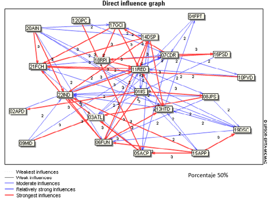 En la segunda fase, bajo un enfoque de sistema, se llevó a cabo un taller con cinco (5) expertos, con el fin de revisión de las relaciones entre las variables. Esto se hizo utilizando una matriz de doble entrada en la aplicación Sheets de Google. Para cada par de variables, se plantean las siguientes preguntas: ¿Existe una relación de influencia directa entre la variable i y la variable j? Si no es así, anotamos 0. En caso contrario, nos preguntamos si esta relación de influencia directa es débil (1), mediana (2), fuerte (3) o potencial (P).