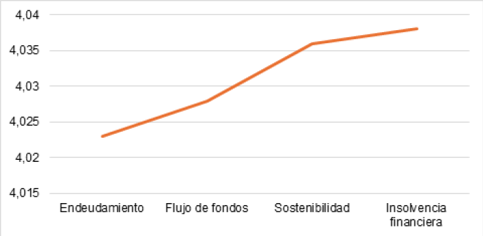 El gráfico 2, muestra la media de los factores insolvencia financiera, sostenibilidad, flujo de fondos y endeudamiento, los cuales están relacionados con la capacidad de las empresas para enfrentar choques macroeconómicos. Se observa una tendencia descendente en los valores promedio, siendo la insolvencia financiera el factor con la media más alta y el endeudamiento el de menor promedio.