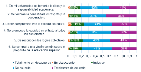 Por lo tanto, un 43% sostuvo que en su institución universitaria se promueve la ética y la responsabilidad académica, mientras que un 41% señaló un compromiso con la excelencia educativa, lo que indica que estas entidades proyectan una identidad institucional en consonancia con principios de formación robustos.