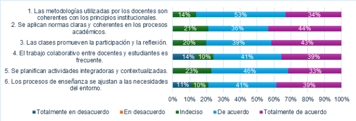 Así también, se valoraron positivamente la participación y la reflexión en clase, con un 39% y 43% respectivamente en la categoría “de acuerdo”, lo que refleja un compromiso institucional con metodologías activas. Cabe mencionar que, estos componentes reflejan una cultura empresarial que no solo aspira a comunicar saber, sino también a fomentar la participación, la contextualización del aprendizaje y la construcción conjunta del conocimiento.