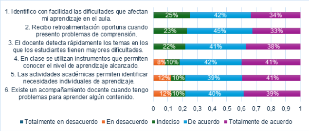 Así también, los estudiantes identifican con precisión los obstáculos a los que se enfrentan durante su formación académica, dado que un 42% concordó y un 25% se alineó completamente con esta declaración. Además, se muestra que el 45% de los participantes en la encuesta considera que obtiene una retroalimentación adecuada cuando tiene dificultades de entendimiento. Los hallazgos muestran una visión predominantemente favorable de los estudiantes en relación con las tácticas institucionales y pedagógicas para respaldar el proceso de aprendizaje (gráfico 5).