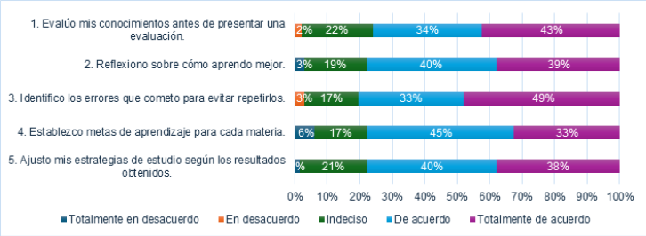 Un 43% expresó su total concordancia en que evalúa sus saberes antes de un examen, y un 49% admitió reconocer los errores realizados para prevenir su repetición, lo que indica una sólida inclinación hacia el aprendizaje independiente y consciente. Asimismo, el 39% y 40% declararon meditar acerca de cómo mejoran su aprendizaje, lo que sugiere que un gran número de estudiantes utiliza procesos metacognitivos que promueven la mejora constante en su rendimiento académico. No obstante, a pesar de los elevados porcentajes, aún existe un segmento considerable de estudiantes que se encuentra inseguro con porcentajes de 17% y 22%, particularmente al definir objetivos o modificar estrategias de estudio, lo que podría señalar falencias en la educación para la autorregulación del aprendizaje.