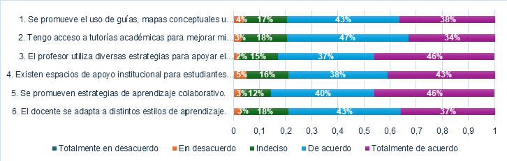 Es decir, el 43% sostiene estar de acuerdo y el 38% está completamente de acuerdo en que se fomenta la utilización de guías, mapas conceptuales u organizadores gráficos, instrumentos esenciales para simplificar la comprensión de contenidos complicados. Igualmente, el 47% de los estudiantes expresó su conformidad con tener acceso a tutorías académicas, lo que refuerza la cultura del apoyo personalizado.