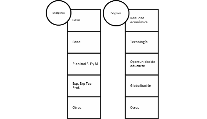 Existen una serie de factores determinantes que se encuentran asociados a este fenómeno; es complejo detallarlos. Sin embargo, para materia del presente estudio, se clasificarán como endógenos y exógenos; los determinantes endógenos son aquellos discriminantes del individuo, como el sexo, edad, plenitud de sus facultades físicas y mentales, especialización y experiencia técnica profesional, entre otros. Por otro lado, los exógenos son la realidad económica de un país (políticas económicas equivocadas, ciclos económicos, depresiones), la tecnología, oportunidades de educarse, formarse, entre otros.