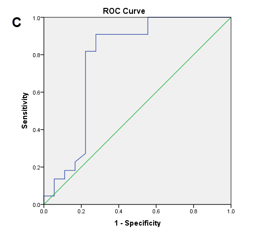 Gra: Granulocyte, AUC: Area under curve, Std. Error: Standard error, Asymp. CI: Asymptotic confidence interval, WBC: White blood cell, MCV: Mean corpuscular volume FIGURE 1. ROC analysis of WBC (A), granulocyte (B) and MCV (C) values