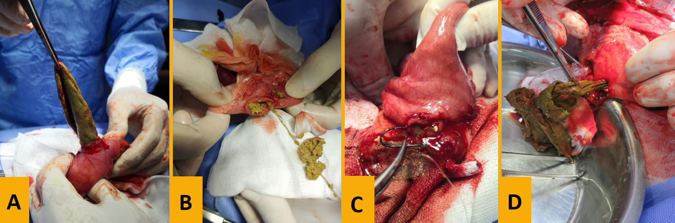 FIGURE 2. Removal of various FB materials from the area of localization during the surgery. A: socks, B: sewing needle and thread, C: fishing rod and fishing line, and D: a piece of cloth