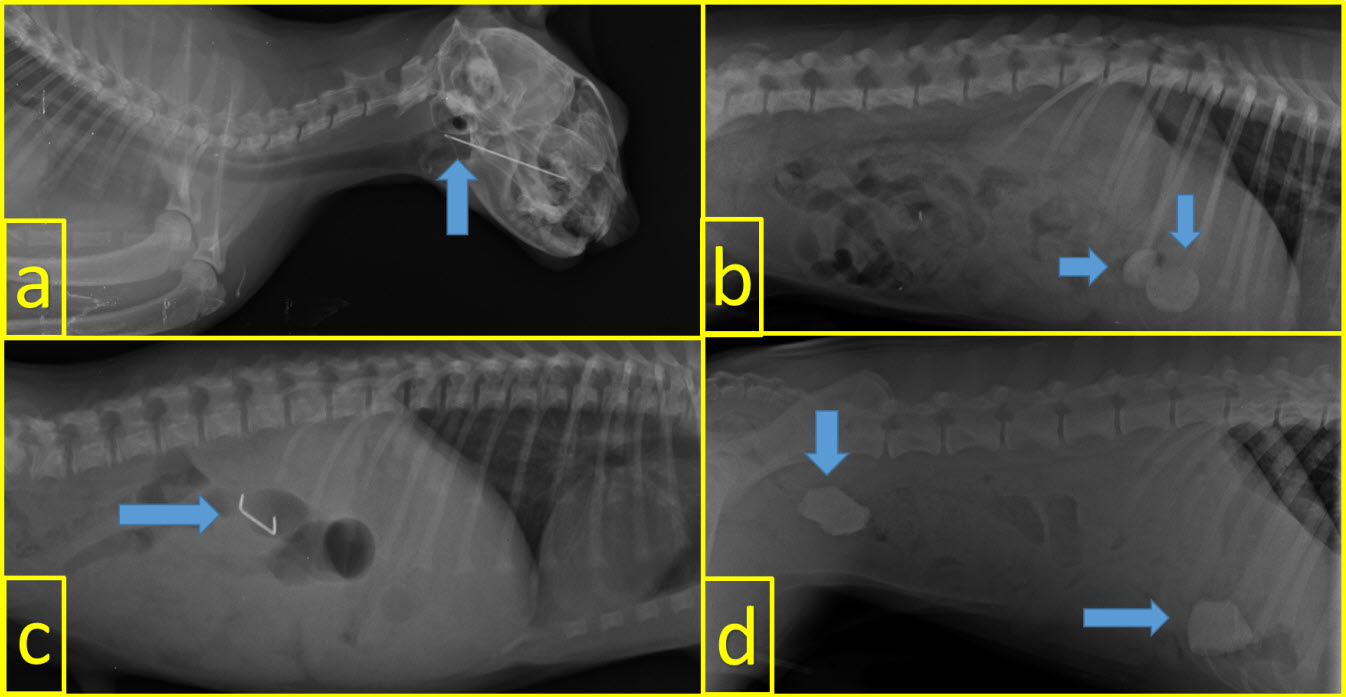 The locations of FB in the gastrointestinal system were as follows: stomach in 14 (43.75 %) animals, small intestine in 10 (31.25 %), esophagus in six (18.75 %), and large intestine in three (9.38 %). FB were detected in both small intestine and large intestines only in one patient. Some of the FB detected by radiography are shown in FIGS 3 and 4.