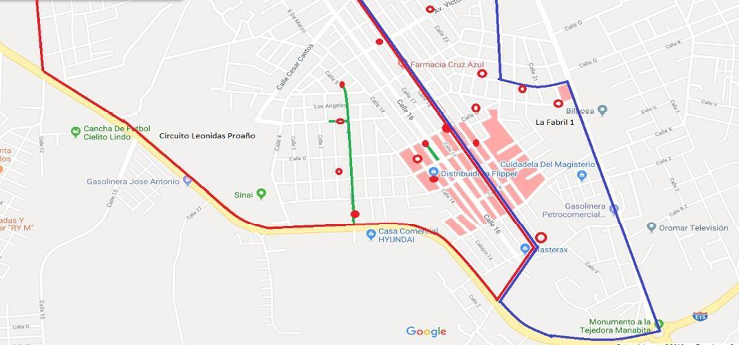 En el gráfico 2 se marcan las cuadras con color salmón donde se acelera la actividad delictiva, fundamentalmente, dirigida a foráneos del polígono que ingresan a esta zona por razones comerciales (farmacias, tiendas, distribuidora de atún -pesca de arrastre y alta mar-). En casi todos los puntos comerciales ha habido actividad delictiva, y en la farmacia “Cruz Azul” que se muestra en el mapa, han habido más de 4 asaltos a la fecha de la aplicación de los MCC, en los últimos dos años. La vía comercial controlada y depredada (azul y roja) es la misma que separa cantonalmente a Manta de Montecristi. Esto puede deberse a que una zona de difícil definición administrativa puede permitir a las autoridades policial no actuar diciendo que ese no es su territorio. Este fenómeno se observó en el Barrio la Libertad de Quito y, en la misma Leonidas Proaño, es visible que el callejón donde se ubica en centro del poder, es el que separa las administraciones circuitales de la policía. Estas coincidencias hacen pensar en que las decisiones de vigilancia fueron tomadas junto a información policial privilegiada, que incluso tuvieron acceso a la definición misma del circuito, el cual se debió establecer entre el 2011 y el 2012.