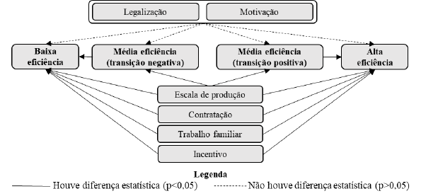 A Figura 1 apresenta como os fatores de produção se relacionam com o nível de eficiência da utilização da mão de obra na atividade leiteira em Minas Gerais. Ela indica que propriedades em transição positiva poderão ter altas produtividades no futuro, ao passo que aquelas em transição negativa, podem ter baixas produtividades no longo prazo. Uma vez que os fatores Legalização e Motivação não apresentaram diferença significativa (p<0,05) entre os agrupamentos, entende-se que estejam relacionados às propriedades leiteiras, indiferente de qual seja seus níveis de produtividade.