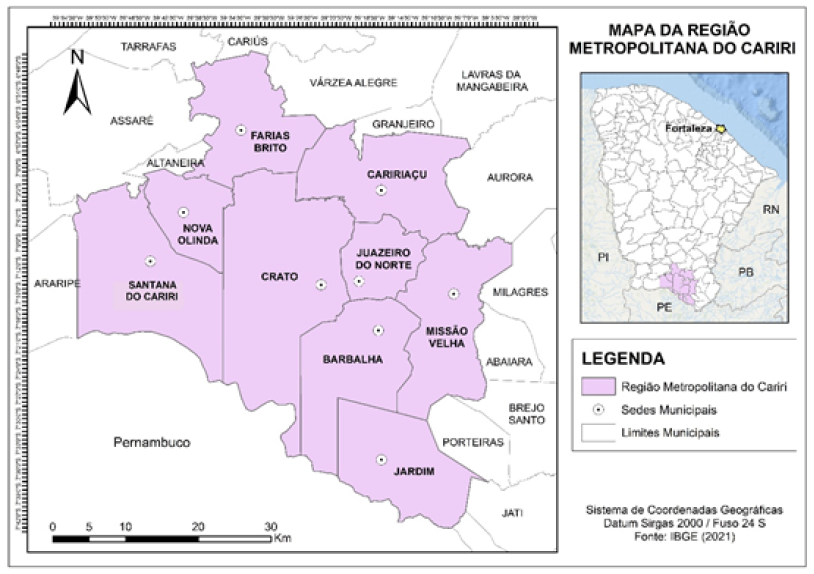 A Região Metropolitana do Cariri - RMC está localizada na região sul do estado do Ceará, idealmente localizada no centro do nordeste brasileiro. Essa região metropolitana é atualmente composta por nove municípios e com população estimada para 2021 em cada município: Juazeiro do Norte com 278.264 habitantes, Crato com 133.913 habitantes, Barbalha com 61.662 habitantes, Jardim com 27.187 habitantes, Missão Velha com 35.566 habitantes, Caririaçu com 28.008 habitantes, Farias Brito com 19.330 habitantes, Nova Olinda com 15.798 habitantes e Santana do Cariri com 17.726 habitantes conforme dados do Instituto Brasileiro de Geografia e Estatística (IBGE, 2021).