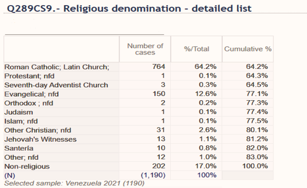 Adicionalmente, estos datos coinciden, al menos de forma estadística, con aportes de fuentes especializadas como Latinobarómetro (2020), quienes en su análisis en línea grafican las respuestas de informantes venezolanos a la pregunta ¿cuál es su religión? de la siguiente manera: