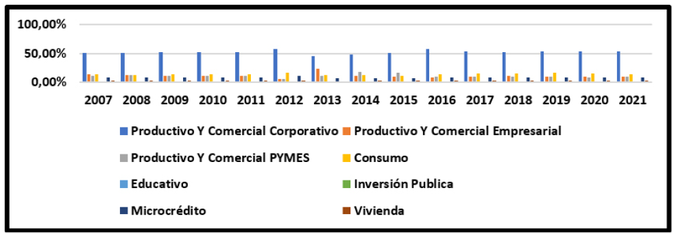 No obstante, la Superintendencia de Bancos (2022) señala que el crédito productivo corporativo paga una tasa mínima de 9,33 %, el empresarial 10,21 % y las PYMES 11,83 %. Sin embargo, el PIB del sector financiero en el Ecuador pasó de 2,55 % del PIB total a precios corrientes en el año 2007, a 3,59 % en el año 2019; a 3,89 % en 2020 y a 3,64 % en 2021, es decir no hubo un efecto negativo por la pandemia Covid-19, solo que el sector ha tenido un crecimiento muy lento; ello explica su poca contribución al crecimiento económico.