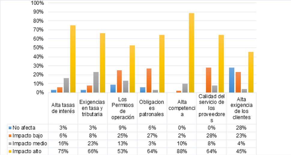 Respecto de factores del micro entorno que han incidido para el decrecimiento productivo se señala: la competencia externa que ha saturado el mercado con productos de bajo costo 88%; las altas tasas de interés para los micro créditos 75%; la inestabilidad tributaria 66%; los proveedores y la ley laboral con un 64%. Empresarios aducen que la responsabilidad recae en “alguna política desatinada” del Estado.