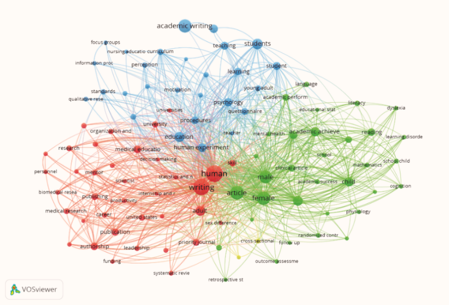 En el clúster 2, identificado con el color verde con (33) ítems, las palabras artículo (n = 310), femenino (n = 289), masculino (n = 269), estudio controlado (n = 143), indican un énfasis en estudios sobre diferencias de género en la escritura de artículos. Puede obedecer a un interés por explorar brechas y desigualdades entre hombres y mujeres en cuanto al acceso a la publicación académica.