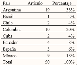 Tabla 1 Porcentaje de artículos consultados por país y año