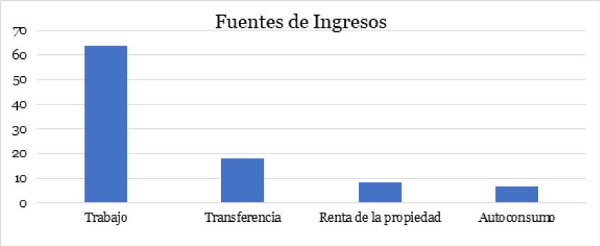 De conformidad con los datos del INEGI (2024), las principales fuentes de ingreso en el medio rural son el trabajo, las transferencias, la renta de la propiedad y el autoconsumo. La mayor parte proviene del trabajo (63.7 %), seguido por transferencias como apoyos de programas sociales o remesas enviadas por familiares (17.9 %). En menor medida se encuentra la renta de la propiedad (8.6 %) y el autoconsumo, pues muchas familias producen parte de sus propios alimentos o demás bienes (6.8%). Este comportamiento se ve en la gráfica 2: