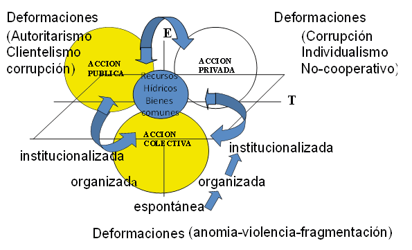 El esquema de Bustos (2014), “resume de manera simple, las tres esferas de acción de la gestión territorial, en este caso aplicado a la gestión de un recurso entendido como bien común el agua” (p.270). O mejor dicho una cuenca hidrográfica entendida como territorio. La acción pública, como acción gubernamental que, a partir de una institucionalidad específica, políticas públicas y proyectos, gobierna. La acción privada, asociada a una lógica de maximización de la ganancia y a una apropiación privada; y, la acción colectiva, con distintos grados de organización y participación en la defensa de intereses diversos. El equilibrio entre los tres componentes da una estabilidad al sistema que de todas maneras se concibe como dinámico. Este sistema de interacción en un espacio determinado, puede generar consensos, acuerdos o pactos territoriales, pero también conflictos.
