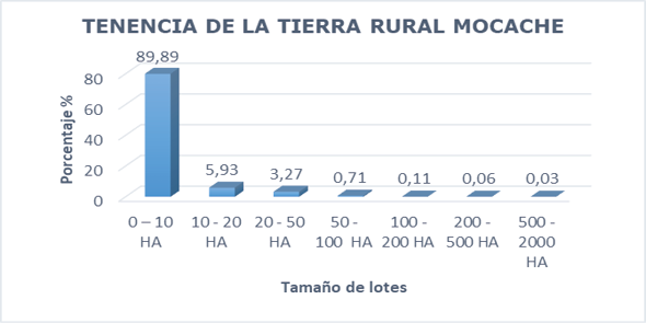 Asimismo, la estructura de la tenencia de la tierra rural en el cantón Valencia, Quevedo y Mocache, expresada en porcentajes en relación a las diferentes categorías de superficie correspondiente a la parte alta de la cuenca del rio Vinces, se presenta en el Gráfico IV. La Organización de las Naciones Unidas para la Alimentación y la Agricultura (FAO, 2008) sostiene que: “La tenencia de la tierra y los derechos de propiedad sobre ella resultan indispensables no sólo para el desarrollo económico y social sostenible y la mitigación de la pobreza, sino también para la gestión del riesgo” (p.4), así como de la disminución de los efectos en relación a los desastres naturales.