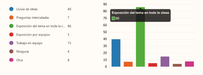 El Gráfico III, evidencia que la exposición de clase es la estrategia más usada por el profesor (a) con un 51,8% (86 estudiantes), seguido de lluvia de ideas con un 24% (40 alumnos), por lo tanto, se sugiere utilizar otro tipo de técnicas de impartición de clase donde no solo esté centrada en el docente y la exposición de los temas; y solo un 9% de los estudiantes identificaron el trabajo en equipo.