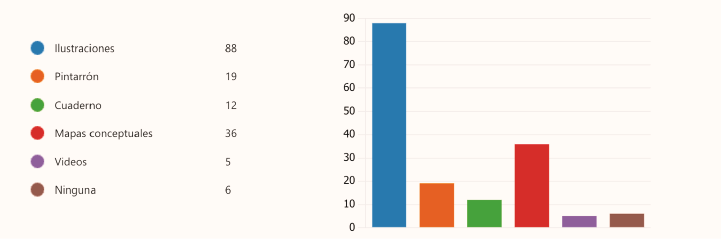 Por su parte, el Gráfico IV muestra que las ilustraciones son las más usadas con un 53% (88 alumnos), seguido por los mapas conceptuales con el 21,7% (36 estudiantes), y el pintarrón como tercer lugar mencionado por 19 educandos con un 11,5%, la recomendación sería usar otro tipo de recursos, videos, gráficos, mapas mentales, o implementar cursos en el uso de recursos digitales al interior de la preparatoria.