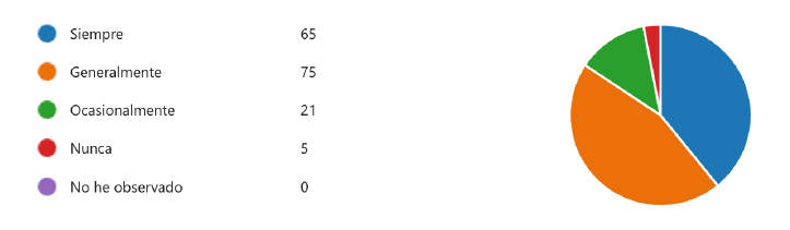 Los resultados del Gráfico II, muestran que, por un lado, un 41,6% (69 estudiantes), consideraron que generalmente terminan a tiempo las unidades del programa; por otro lado, un 36,8% (61 alumnos), mencionaron que ocasionalmente, y un 14,5% contestaron que siempre. Por lo tanto, la planeación de clase y tiempos es correcta por parte de los docentes de la asignatura, puesto que terminan los contenidos de manera adecuada en tiempo y forma.