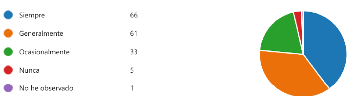 Los resultados del Gráfico XI, mencionan a un 39,8% de los alumnos (66) que consideran que siempre los docentes aclaran las dudas sobre el tema a desarrollar, un 36,7% (61 estudiantes) contestaron que generalmente, y 20% manifestaron que ocasionalmente. Por lo tanto, también se consideran positiva la percepción por parte de los estudiantes.
