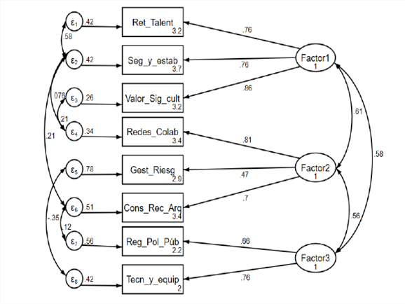 El análisis SEM en la Figura I, reveló que la retención del talento y la seguridad y estabilidad fueron los factores más influyentes en el modelo, con cargas factoriales de 0.76 en ambos casos, lo que indicó que estos elementos fueron percibidos como aspectos importantes para el desarrollo económico y social en la región. Dentro de las variables que se consideraron para el factor 2 se identificó que, las redes de colaboración son los aspectos para considerar debido a su alta relación con el factor (0.81) junto con la conservación de recursos arqueológicos.