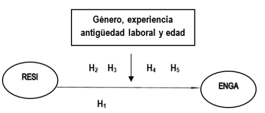 En el análisis conjunto de las dos variables, Ridho et al. (2023) demostraron que el género modera la influencia de la resiliencia en el engagement; en tanto que Yang et al. (2022) consideraron edad y sexo como variables de control en la relación entre resiliencia y engagement. Por el contrario, en esta relación Navarro-Abal et al. (2018) no encontraron efecto moderador del género, aunque sí de la antigüedad laboral. Con base en la revisión de la literatura especializada y la controversia sobre los efectos moderadores de variables sociolaborales, se plantean las hipótesis siguientes (ver Figura I):