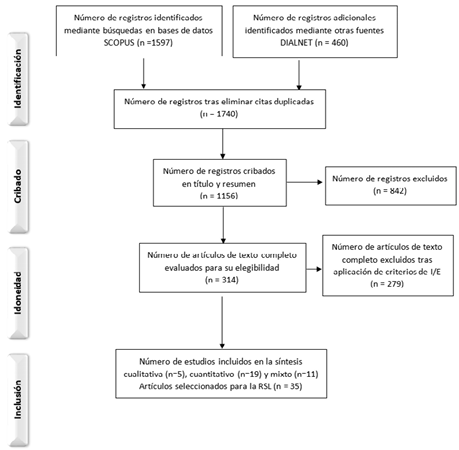 Se estableció cuatro fases a través del protocolo PRISMA, como se puede observar en la Figura I, en la cual se expone un resumen gráfico del proceso de filtración de la muestra conformada por 35 artículos. En la primera fase, se usó la estrategia de búsqueda en las bases de datos Scopus y Dialnet, arrojando inicialmente 2.057 documentos. Luego, se eliminaron los duplicados, obteniéndose 1.740 documentos. En la segunda fase, se filtró en base a la lectura del título y el resumen, aplicando los criterios de inclusión (CI1 al CI4) y criterios de exclusión (CE1 al CE4). A partir de estos criterios, se excluyeron 842 de 1.156 artículos cribados en título y resumen. Posteriormente, se realizó la filtración en función de la lectura de texto completo, excluyendo 279 de 314 artículos. Finalmente, se obtuvo 35 artículos que componen la muestra de la presente revisión sistemática.