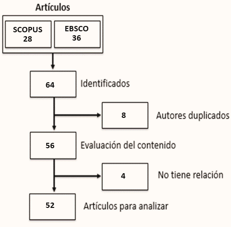 Mientras que, en EBSCO la opción de búsqueda fue: “Ingeniería inversa en la minería de datos abiertos de la gestión pública” logrando obtener 36 artículos. En total se registraron 64 artículos para el estudio. Se analizó el contenido informativo y se encontraron 8 autores duplicados y 4 artículos cuyo contenido no se relaciona con la gestión pública. El filtro finalmente permitió revisar 52 artículos.