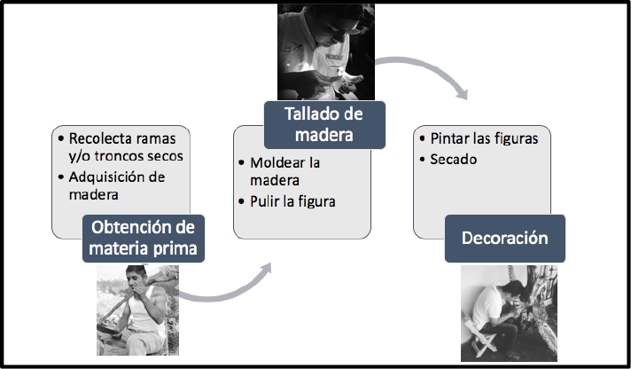 La forma en la que se organizan los artesanos de madera es por familias, los trabajos los realizan en sus hogares y se involucran todos los integrantes de familia, desde lo mas jovenes o niños que se encargan de recolectar las ramas secas en el bosque, otros ya comienzan con el tallado de la madera dando forma según la rama o tronco de árbol puede ser una pequeña ave como el colibri que es característico en la comunidad o un jaguar a tamaño real, y finalmente la decoración de la figura ya terminada con la técnica proporcionada por los maestros artesanos de más edad como se muestra a continuación en el diagrama 2.