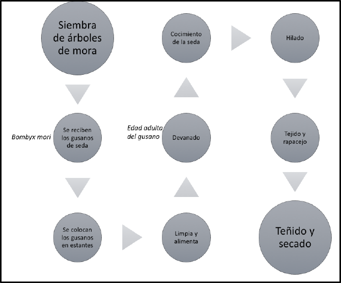 La inversión de tiempo y cuidados para la crianza del gusano de seda y producción de artesanías de seda es muy alto, ya que implica desde la siembra y los cuidados para el crecimiento de los árboles de moreras, mínimo tres años, incluyendo también todo el proceso para el crecimiento de los gusanos de seda, alimentación y limpieza; la organización familiar ha permitido una buena coordinación ya que es necesario alimentarlos tres veces al día durante varias semanas. Organizan sus tiempos, mientras unos cortan y lavan hojas de mora, otros dan de comer a los gusanos, como se puede ver en el diagrama 3