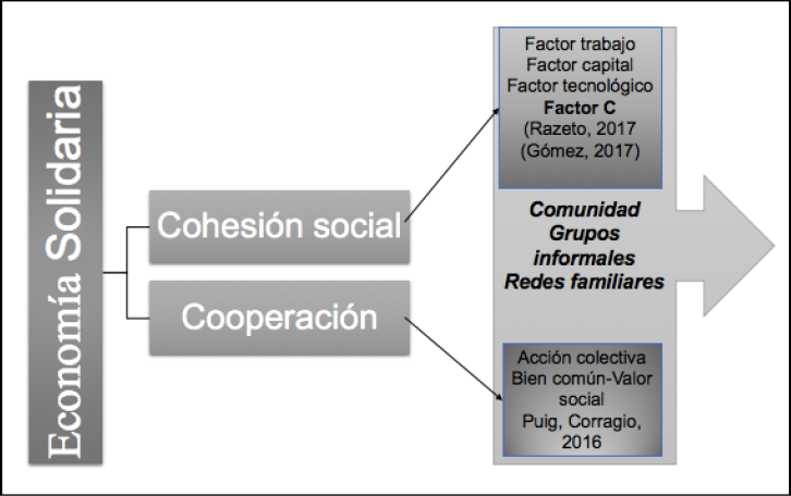 Así, es como la economía solidaria es concebida en una idea de comunidad donde la cooperación y luego especificado en la variable de cohesión social (Factor C), junto con el factor trabajo, factor capital y factor tecnológico (Gómez, 2017:4) como se muestra en el diagrama 4.