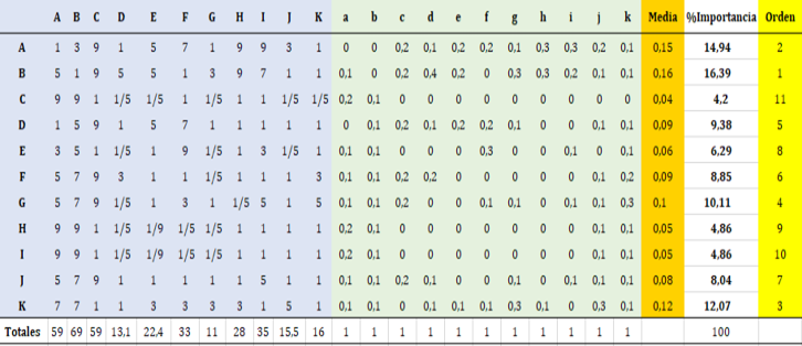 Nota: La tabla describe la puntuación dada a cada una de las estrategias diseñadas de acuerdo a los siguientes parámetros: 1 = Igual de Importante; 3 = Ligeramente más importante (1/3 Ligeramente menos importante); 5 = Más importante (1/5 Menos importante); 7 = Bastante importante (1/7 Bastante menos importante); 9 = Mucho más importante (1/9 Mucho menos importante).