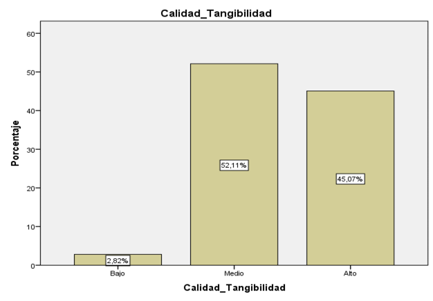 En el presente estudio en la dimensión Tangibilidad de la variable calidad de servicio, se evidencia el predominio de un nivel medio con 52,1 % de percepción de tangibilidad. Seguido del nivel alto de percepción con un 45,1% y un nivel bajo con un 2,8 % en la dimensión tangibilidad. Estos resultados difieren de otra institución educativa. En el cual, obtuvieron en la evaluación del estado de la calidad de las instalaciones de los servicios del campus un bajo nivel de satisfacción de los estudiantes, lo que se desprende de la brecha existente entre las percepciones y las expectativas de los usuarios, donde para cada ítem hay un resultado negativo. Es decir, la calidad de las instalaciones de servicios del campus sigue estando muy por debajo de las expectativas de los usuarios (Napitupulu et al, 2018).