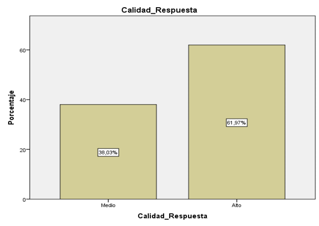 En la tabla 4 la dimensión Capacidad de respuesta de la variable calidad de servicio, de 142 estudiantes que representan el 100% se evidencia 88 estudiantes que representa el 62 % alcanzó el nivel alto. Además 54 estudiantes se encuentran en el nivel medio con un 38 % de calidad de respuesta. En esta dimensión, ningún estudiante se encuentra en el nivel bajo.