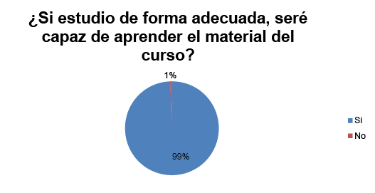 Analizando los resultados, encontramos que la motivación es fundamental en el aprendizaje de los estudiantes del curso de Argumentación Jurídica, ya que en su mayoría han aceptado que, si ellos estudian de forma adecuada, serán capaces de aprender el material del curso dictado por el docente (Gráfico 1).