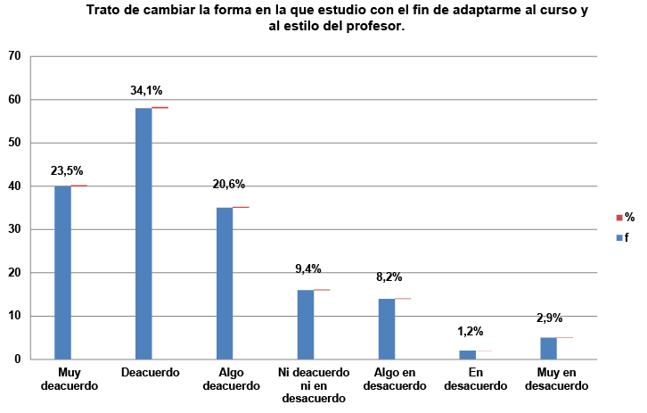 Según la Escala de Likert el mayor porcentaje se encuentra en la punta “deacuerdo”, con un 34.1% seguido de “muy deacuerdo” con 23.5%, y “algo deacuerdo” con 20.6.%, esto representa que la mayoría de los estudiantes se encuentra deacuerdo con tratar de cambiar la forma en la que estudia con el fin de adaptarse a los requerimientos del curso y al estilo del profesor. Luego “ni deacuerdo ni en desacuerdo” con un 9.4% seguido muy de cerca con “algo en desacuerdo” con un 8.2% y en un porcentaje menor “muy en desacuerdo” con 2.9% y “en desacuerdo” con 1.2% (Gráfico 4). Estos resultados demostrarían su nivel de desempeño y compromiso con el curso y el docente.