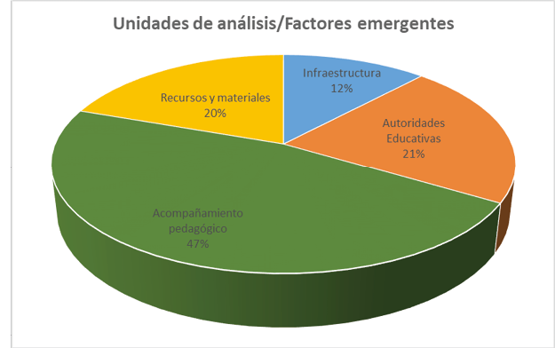En este mismo proceso de análisis, los resultados develan que los factores emergentes derivados de las respuestas de los docentes en torno al factor clave gestión educativa son los siguientes: infraestructura, autoridades, acompañamiento pedagógico, recursos y materiales. Su incidencia porcentual se aprecia en el siguiente grafico 2