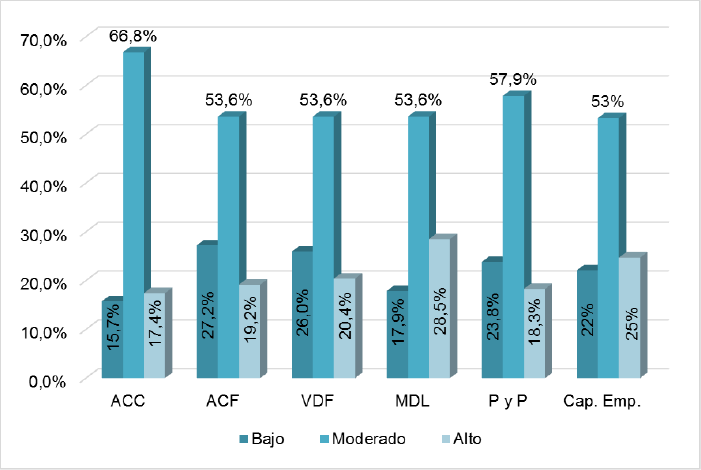 Con el objeto de conocer el nivel de capacidad emprendedora de los estudiantes de la Escuela Profesional de Administración de la Universidad Nacional de San Agustín de Arequipa, se realizó el análisis, donde se agrupó la información de las distintas dimensiones utilizando la herramienta SPSS, teniendo en cuenta la media y la desviación estándar de cada dimensión, los resultados reflejaron que las dimensiones en estudio (autoconciencia, autoconfianza, visión de futuro, motivación de logro y planificación y persuasión). De acuerdo al Gráfico 1, se manifiesta que el 53% de los estudiantes mostraron un nivel moderado de capacidad emprendedora. Esto quiere decir que las capacidades de actuar con iniciativa, perseverancia y poder convertirse en un agente de cambio de la realidad, son aceptables.