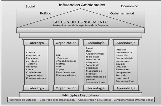 Stankosky (1999, 2005) desde las investigaciones de Nonaka y Takeuchi (1995), Tejedor y Aguirre (1998) y Andersen (1999) entre otras, definen un marco que integra o agrupa elementos de GC bajo cuatro pilares: liderazgo, organización, tecnología y aprendizaje (diagrama 1).